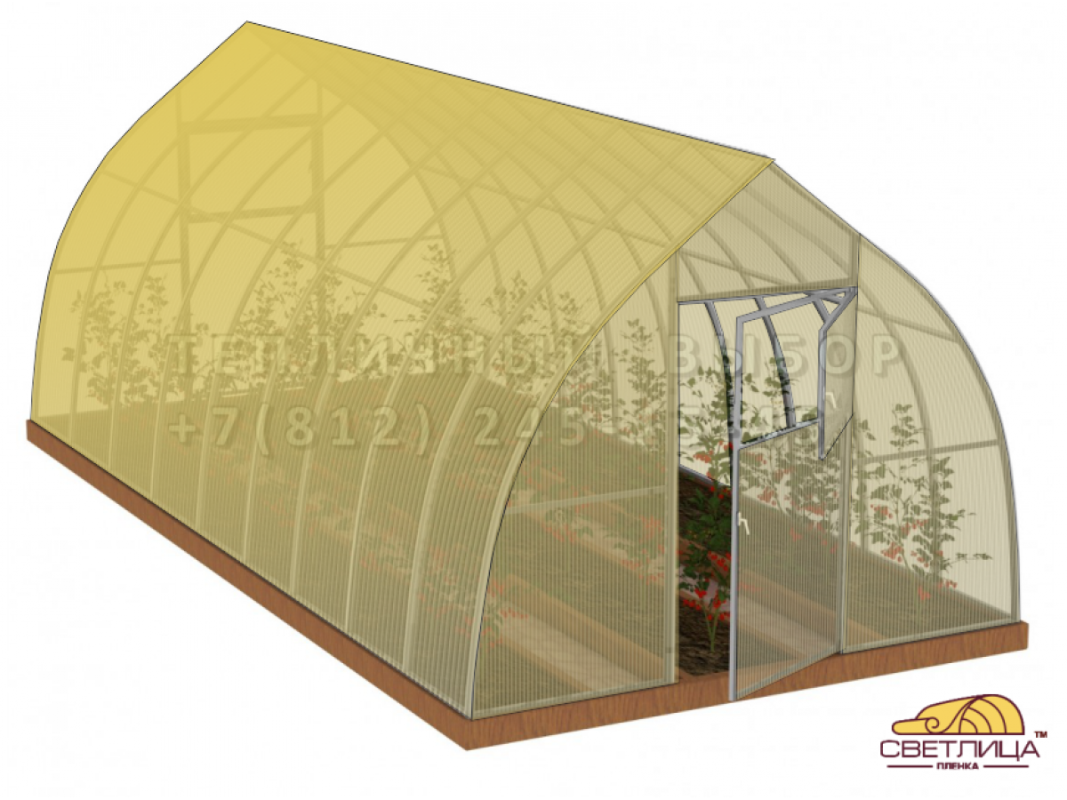 - укрывной материал - легендарная пленка «Светлица» толщиной 150 мкм, имеет уникальный состав, который делает ее прочной, эластичной и долговечной (не менее 7 лет без снятия на зиму)